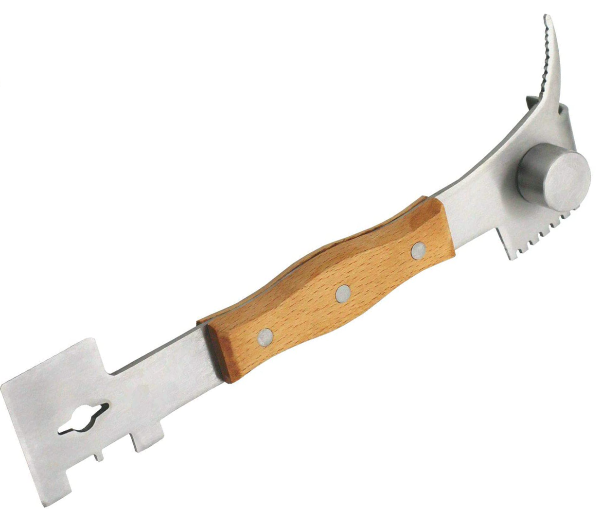 Das Werkzeug vereint Stockmeißel, Wabenheber, Wabenkratzer, Nagelzieher und Hammerfläche in einem einzigen Multifunktionstool.
