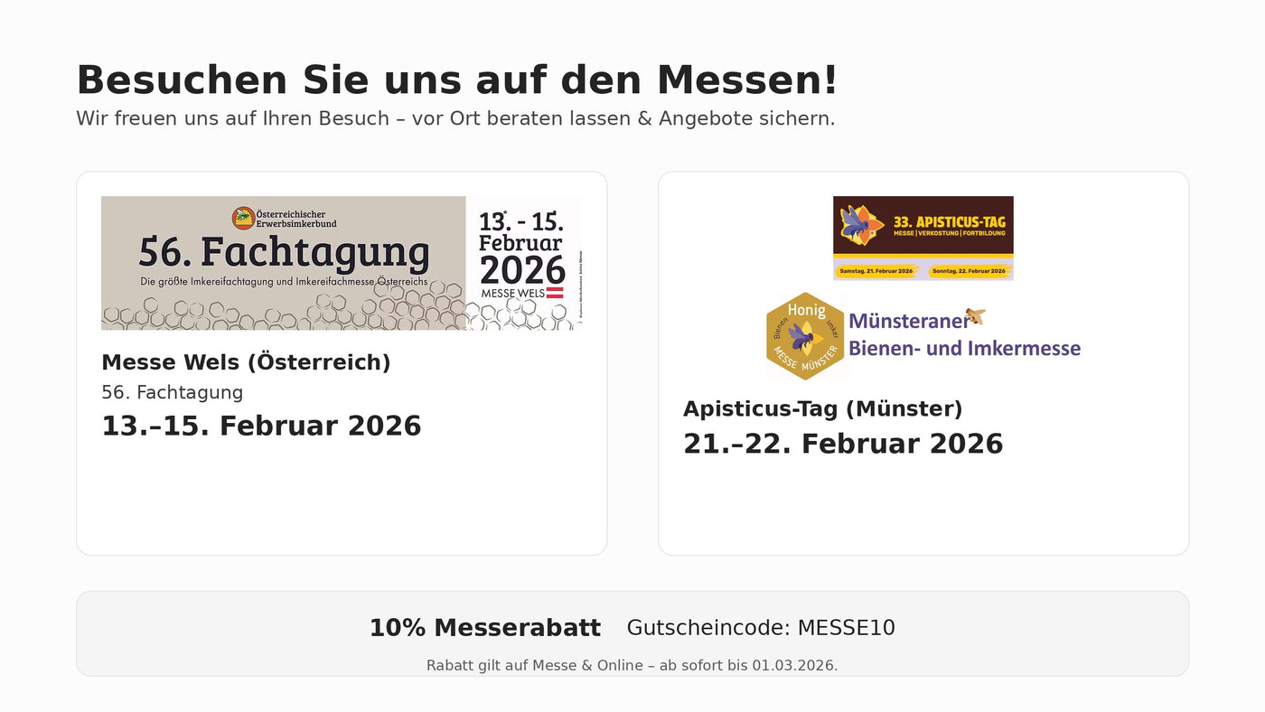 Sie möchten unsere Produkte live erleben? Besuchen Sie uns gerne in unserem Lager in Iserlohn und überzeugen Sie sich vor Ort von der Qualität. Ist der Weg zu weit? Kein Problem – wir sind regelmäßig auf den wichtigsten Imkermessen in Deutschland und Österreich für Sie da.